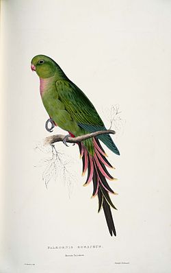 En langage vernaculaire, certains amateurs lui donnent aussi le nom de Perruche d'Alexandra. Pièce jointe 99061 Pièce jointe 99063 Polytelis alexandrae Source : Wikipédia. Aire de distribution : L'intérieur de l'Australie, depuis le sud du territoire du Nord jusqu'au Nord de l'Australie Méridionale et jusqu'à l'est de l'Australie Occidentale Description : les plumes centrales de ses ailes sont d’un jaune vif, les rémiges sont vertes, son croupion est bleu, ses rectrices sont vertes et rouges, le haut de sa tête est bleu clair tandis que des joues à la poitrine son plumage est rose. La Princesse de Galles habite les steppes arides et les régions semi-désertiques du centre de l'Australie. Elle n'y a qu'un seul biotope : - les régions de spinifex, ou croissent diverses espèces d'herbes à piquants, dure et sèche (genre (Trioda). Dans ces régions, elle préfère s'établir à proximité des cours d'eau périodique (Creeks), dont les rives sont garnies d'arbres à haute futaie, qui lui procure les endroits de nidification lui convenant. Pièce jointe 99062 Illustration : Ustas/GFDL for FNature. Dimorphisme sexuel : -Le mâle a le sommet du crâne bleu pâle et la gorge rose. Les parties inférieures sont bleu-gris et les ailes ont une nuance plus verdâtre. Chez la femelle, la calotte est moins brillante et est plus grise que bleue. La taille est d'environ 40 cm. à l'âge adulte et sa longévité est de plus ou moins 20 ans. Cette Perruche se caractérise par deux propriétés typiques à beaucoup d'espèces d'oiseaux du centre de l'Australie. * En premier lieu, elle est clairsemée parce qu'à l'intérieur de son immense aire de distribution, elle est restreinte à ces endroits précis où elle pourra trouver des points d'eau et des cavités de nidification. * En second lieu, elle mène une vie nomade et peut, en cas de périodes sèches ou de conditions d'existences défavorables, délaisser complètement et brusquement une contrée où elle vivait. Tout aussi brusquement, elle surgit alors dans une autre contrée, où elle n'avait plus été observée pendant des années voire des dizaines d'années. Le même comportement se retrouve chez les Perruches ondulées et de Bourke, chez la Callopsitte et la Perruche nocturne. Pour cette raison, il est difficile d'évaluer la population globale de cette espèce. Elle ne s'assemble jamais en grandes volées et ne semble nulle part être très nombreuse. Mais la patrie de la Perruche Princesse de Galles se trouve précisément dans la partie de l'Australie qui est, jusqu'à nos jours, la plus faiblement habitée et la moins explorée. Ce qui plus est, cette Perruche mène une vie très discrète et cachée, et échappe donc facilement à l'attention des observateurs. Il se peut donc que le niveau global de sa population soit encore relativement haut. Elle semble en général fuir le voisinage de l'homme. Par suite de son mode de vie nomade, la Perruche Princesse de Galles ne montre aucune indication de formation de races : - elle se comporte donc en ceci comme la Perruche ondulée et la Callopsite. En tout cas, la variabilité individuelle dans les teintes du plumage semble assez prononcée. La Perruche Princesse de Galles n'a été découverte qu'en 1862, comme dernier membre des trois espèces de "Polytelis" Une expédition sous la direction de John Mc.Douall.Stuart. avait essayé pour la première fois en 1860, de traverser le continent du sud au nord. Elle échoua par suite de manque d'eau et de vivres et aussi à cause des attaques de la part des aborigènes. Le groupe ne parvint que jusqu'à l'endroit où s'élève actuellement la ville d'Alice Springs, la plus grande agglomération au "cœur mort" de l'Australie. Une deuxième expédition se vit, elle aussi, obligée de faire demi-tour à oins de 200 km. plus loin vers le nord et ce n'est que la troisième tentative qui fut finalement couronnée de succès. Au cours de cette troisième expédition, l'ornithologue Frederik Walterhouse, dont le nom fut plus tard donné à la Waterhouse Range en Australie Centrale, vit pour la première fois une volée de Princesses de Galles et parvint à capturer deux sujets. Pièce jointe 99064 Couple de Princesse de Galles verte en captivité. John Gould a décrit l'espèce en 1863 et l'a nommée Princesse de Galles, en l'honneur de la Princesse Alexandra, une fille du roi de Suède qui, par son mariage, est devenue Princesse de Galles. * Pour info, l'actuelle Princesse de Galles est Camilla Parker Bowles, épouse du Prince Charles d'Angleterre. Par la suite, la Perruche Princesse de Galles n'a été aperçue qu'en 1894 par des membres de la célèbre Home-expédition, qui observèrent deux exemplaires à la Petermann Creek, au sud-est de l'actuel Hermannsburg. Depuis lors, la Perruche Princesse de Galles ne fut observée que par sujets isolés. Cette Perruche mène une vie très secrète. Elle se tient presque toujours par terre, où elle recherche sa nourriture parmi les touffes d'herbes spinifex. Lorsqu'un danger la menace, elle essaie en premier lieu de se mettre en sécurité en courant, et ne prend l'air qu'au tout dernier instant. En liberté, cette espèce ne fait que rarement entendre son haut appel peu mélodieux, mais les couples émettent au contraire, un gazouillis continuel dès qu'ils sont perchés dans un arbre ou un buisson. Les oiseaux sont absolument silencieux lorsqu'ils se trouvent au sol. La nourriture comprend presque exclusivement les semences de l'herbe spinifex. Ainsi, la Perruche Princesse de Galles appartient aux rares espèces d'oiseaux de l'Australie Centrale, qui parviennent à utiliser cette herbe piquante comme source de nourriture. Contrairement à la Perruche nocturne, elle ne niche pourtant jamais dans les touffes de l'herbe spinifex, mais bien dans les grosses branches creuses et les souches d'arbres creuses. Elle aime couver dans les cavités des hauts eucalyptus (Eucalyptus camaldulensis) qui croissen