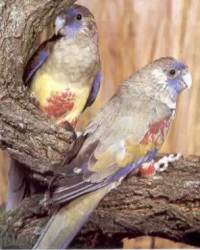 Aire de distribution : L'est et le sud du continent australien, depuis le sud-ouest du Queensland via la Nouvelle-Galles du Sud jusqu'au nord-ouest de Victoria, plus loin aussi dans les régions nord-est et sud de l'Australie Méridionale et dans le sud de l'Australie Occidentale. Northiella haematogaster. Source : GFDL, User:Ustas/GFDL for FNature La Perruche Blue-Bonnet a été plusieurs fois classée dans un genre séparé, qui forme une transition entre les véritables Psephotus vers le genre Platycercus et la Perruche de Bauer (genre Burnardius). Cette séparation génétique a été admise en raison de la forme de l'aile et de la structure des cinq rémiges primaires externes. Pendant la parade, le mâle se redresse de toute sa hauteur, fait trembler les ailes soulevées, fait de rapides hochements de la tête de haut en bas et fait tourner la queue étendue de gauche à droite. Contrairement à la plupart des Perruches platycerques, les plumes du front et du crâne sont en même temps complètement redressées. Les deux sexes vont à la recherche d'un emplacement pour le nid. Contrairement aux autres espèces de Psephotus, la Perruche Blue-Bonnet semble nicher uniquement dans les cavités des grosses branches. Généralement, ces oiseaux préfèrent les arbres assez bas et nichent donc à faible hauteur. La nichée comprend de 4 à 7 œufs. Les œufs blancs n'ont pas de lustre et leur coquille est étrangement rugueuse. La période de reproduction vient au cours du printemps et de l'été austral (août à décembre), à l'intérieur du pays, elle est pourtant exclusivement réglée comme pour toutes les espèces habitant l'Australie Centrale, d'après les périodes de pluie, et peut donc venir durant n'importe quel autre mois. Perruche à Bonnet-Bleu - (Blue-Bonnet) Source : Wikipédia Commons. La femelle seule couve, et le mâle la nourrit en dégorgeant. La femelle couve avec beaucoup d'assiduité et, en cas de danger, elle ne quitte son nid qu'au tout dernier moment. Les jeunes prennent l'envol à l'âge de quatre semaines. Même après être devenus indépendants, ils restent encore longtemps en compagnie de leurs parents. La Blue-Bonnet fut montrée en 1862 au Jardin Zoologique de Londres, l'espèce fut élevée la même année avec succès. Elle reste assez farouche, se montre nerveuse et comme toutes les espèces de Psephotus, elle est très agressive. Elle attaque même d'autres Perruches en dehors de la période de reproduction et ne peut être logée que par couples isolés.