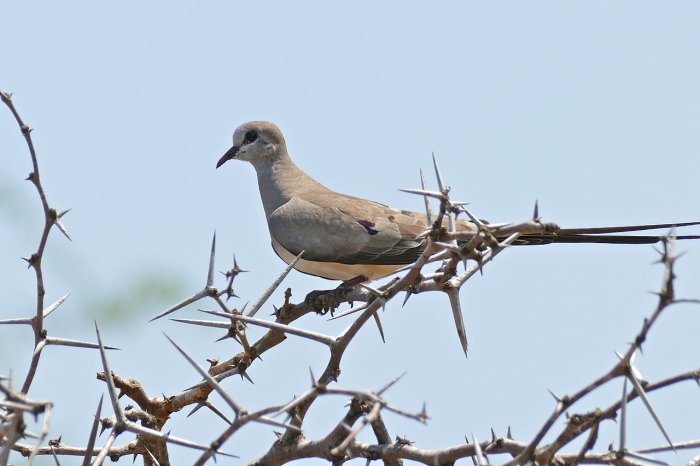 LA COLOMBE MASQUE DE FER - (Oena capensis) Description : Originaire de la presqu'Île du Cap, Province du Cap, Afrique du Sud, Madagascar. C'est une Colombe élancée, mesurant presque 23 cm. et à queue très longue et noire, se terminant en pointe. Le front, le masque, la gorge et la poitrine sont noirs. Le sommet de la tête, les côtés du cou, les scapulaires et les couvertures alaires sont gris, les dernières montrant des taches bleu violacé. Le manteau est brun et le croupion est barré de bandes noires. Le bas de la poitrine et le ventre sont blancs ou blanchâtres. Bec pourpre, yeux bruns, pattes pourpres. La femelle ne montre pas de noir sur le front, la gorge et la poitrine. Commentaire : Ces charmantes Colombes s'adaptent rapidement à la vie de volière, elles deviennent familières et font entendre leur cri "tom-tom-tom" vivement répété. J'ai gardé et exposé cette espèce pendant des années avec succès, j'estime qu'elle est assez fragile et ne se reproduit pas facilement. Grâce à sa familiarité, c'est pourtant une espèce à laquelle on s'attache. J'ai également détenu des Colombes poignardée blanche (Gallicolumba luzonica). Je présentais à ces oiseaux outre le mélange de graines habituelles, beaucoup de pâtée aux œufs coupé de semoule de couscous + de la pâtée universelle ainsi que des vers de farine. En Europe, on les trouve dans beaucoup de collections, elles figuraient jadis entre autres au Parc de Wassenaar (Pays-Bas). De 1903 à 1906, ces Colombes ont été élevées régulièrement en Angleterre. Les amateurs ne doivent donc pas craindre de les acquérir. m@loute45.