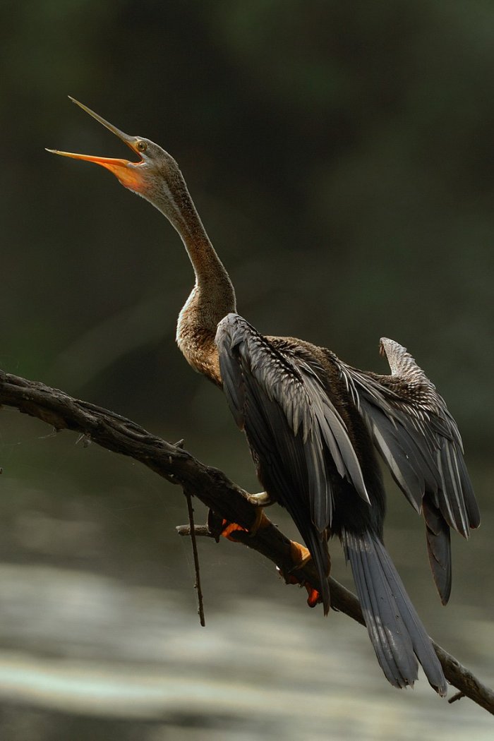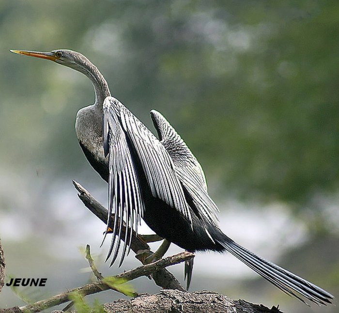 L‘ANHINGA ROUX . (Anhinga melanogaster ) Le long bec pointu est pourvu de dents dirigées vers l'arrière. Le long cou mince prend la forme d'un S en vol, mais lorsque l'oiseau chasse le poisson, le cou se détend comme un ressort et le bec pointu, rapide comme une flèche, empale la proie. De gauche à droite : mâle, femelle et jeune. Les Anhingas peuvent nager sous la surface de l'eau, en se propulsant à l'aide des pattes et des ailes. Même en nageant normalement, il est profondément enfoncé dans l'eau, si bien que l'on voit à peine le corps et que souvent seuls le long cou est le bec pointu sont visibles ce qui leur a valu le nom d'Oiseau serpent. Ils sont maladroits sur la terre ferme, mais grimpent aisément dans les arbres, où ils construisent leur nid volumineux. Les œufs mesurent 36 X 55 mm, ils sont verts clair et recouverts d'une couche de calcaire. La nichée comprend trois à quatre œufs. Les jeunes portent un duvet blanc voilé de jaune, avec une ligne noire sur toute la longueur du cou et du corps. La tête est la gorge sont nues, la première est verte, la seconde jaunâtre. Mâle en vol, remarquez la flexibilité et la forme de leur long cou. Originaire de l'Afrique au sud du Sahara et de Madagascar, ces oiseaux avoisinant les 90 cm de taille. Dans le "Tropicarium du Zoo de Francfort en Allemagne", on peut admirer ces étranges spécimens vivant dans un immense bassin entouré de verre. L'eau est abondamment pourvue de poisson et l'on peut voit les Anhingas plongeant pour capturer leur proie. Lorsqu'ils reviennent à la surface, ils se dirigent vers une branche, où la proie est avalée, après quoi les oiseaux laissent sécher leur plumage. Ils prospèrent en captivité et restent en bonne condition sur un régime de poissons. Comme les Cormorans (Phalacrocoracidae), ce sont de véritables gloutons, qui parviennent à engloutir jusqu'à 40 petits poissons par jour. Les proies plus grandes, mesurant environ 20 cm, leur donnent parfois des complications, mais ils en viennent à bout après une heure et demie. Cette espèce aime aussi manger les petites grenouilles et autres amphibiens. On n'a pas encore parvenu à les faire se reproduire. En hiver, ils doivent séjourner dans un abri chauffé.