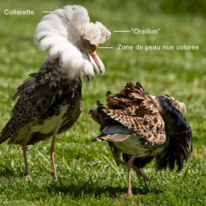 L'impressionnante diversité des ornements des mâles de Combattants variés (Philomachus pugnax) "Des biologistes néerlandais ont dénombré 801 variantes de plumages chez 1 814 mâles". Combattants variés (Philomachus pugnax) mâles au printemps aux Pays-Bas. Photographie : Arjan Haverkamp / Wikimedia Commons Le Combattant varié (Philomachus pugnax) est un limicole présentant un net dimorphisme sexuel, en particulier durant la période de reproduction : les mâles arborent à cette période une parure nuptiale érectile composée d'une collerette (= un collier de plumes autour de la tête et du cou) et de deux oreillons aux teintes (plumes noires, brun-roux, orange, blanches...) et aux motifs (plumes unies, tachetées, barrées) très variables. Ils présentent aussi autour des yeux et à la base du bec une zone de peau nue colorée (jaune, orange, rouge). Durant la parade, ils se rassemblent dans des "arènes" et déploient leurs plumes en adoptant diverses postures (corps dressé, incliné, couché, les ailes étalées ou non...) pour séduire les femelles. Des chercheurs néerlandais ont tenté d'évaluer la diversité de ces décorations : ils ont capturé 1814 mâles au printemps dans la province de la Frise (Pays-Bas) et ils ont noté leurs ornements. Ils ont recensé 801 variantes de plumages. La collerette était d’une seule couleur chez 12 % des mâles, de deux couleurs chez 73 % d'entre eux et de trois pour 15 %. Les plumes variaient peu entre elles pour un mâle donné mais fortement d’un individu à l’autre. Chaque mâle conserve à peu près les mêmes ornementations d’une saison à l’autre. Si la couleur de la zone de peau nue semble aléatoire et indépendante de la couleur de la collerette et des oreillons, ce n'est pas le cas des plumes : certaines combinaisons, comme une collerette et des oreillons blancs, sont plus fréquentes que d'autres. Des associations comme une collerette blanche et des oreillons noirs, une collerette noire et des oreillons blancs, une collerette aux motifs réguliers avec des oreillons aux motifs irréguliers, sont plus rares. Généralement, les couleurs et les dessins de la collerette et des oreillons sont coordonnés. Les caractéristiques du plumage ne semblent pas liés à la taille des mâles. Les biologistes ont aussi noté l'existence d'une relation entre certaines couleurs et la période de la mue : par exemple, seuls les mâles aux plumes entièrement blanches ou dont le dessin est uni avaient déjà entièrement mué en avril. Il est possible que la mue des plumes de certaines couleurs, comme le noir, soit plus lente. Photos : Jari Peltomäki, Jouko Lehmuskallio, M. & W. von Wright: Svenska fåglar (Kansalliskirjasto, The National Library of Finland). La diversité de ces plumages est liée au fait que certaines plumes sont dépourvues de pigments (couleur blanche) tandis que d'autres contiennent de l'eumélanine ou de la phéomélanine (couleur noire unie, barres ou taches sombres). Chaque mâle ne synthétise probablement qu'un type de phéomélanine. La couleur de la zone de peau nue dépend quant à elle de la richesse de l'alimentation en caroténoïdes. Cette variété de coloration s'explique par une expression génétique complexe (dépendant de plusieurs facteurs) des gènes codant pour la synthèse des pigments. Les critères de choix des femelles sont inconnus, mais il est possible qu'elles se tournent en priorité vers des individus dont le plumage est le plus "stimulant", c'est-à-dire le plus original.