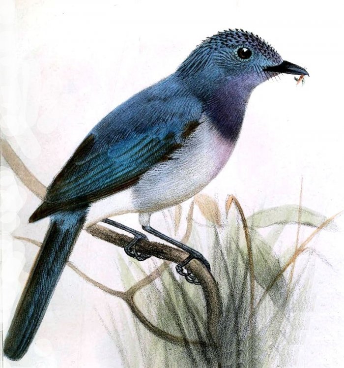 Illustration- source Wikipédia Connaissez-vous ce magnifique Monarchidé asiatique qui compte jusqu'à 23 sous-espèces et que l'on trouve sur une large proportion du Continent asiatique, Pakistan, Inde, Bangladesh, Stri Lanka, Assam et Birmanie, pour ne citer que ces pays là. Lien nous montrant cet oiseau bâtissant son nid et nourrissant ces petits, sublime.. https://www.youtube.com/watch?v=8OcG4U4s5Ys Comme vous avez pu le voir, la couleur générale de cet oiseau est le bleu azur et l'oiseau possède un croissant noir sur la poitrine. On ne voit par contre pas la tache noire sur le dos, les rémiges et les rectrices également noires ainsi que l'abdomen blanc. On notera aussi un cercle oculaire bleu et une fine ligne noire bordant la mandibule supérieure à la base du bec. Le plumage du Tchitrec est soyeux et brillant, le bec est plutôt aplati, large à la base en étant entouré de quelques plumes allongées ( ou devrions-nous dire des "poils"?). Les pattes sont sombres et graciles. Les deux sexes sont identiques quoique la femelle soit plus terne et que la plupart du bleu azur est remplacée chez elle par une teinte brun foncé. Le Tchitrec a une taille de plus ou moins seize centimètres. (Documentation privée)