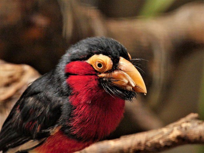 Description : Le dessus du corps est noir, avec une bande frontale rouge, il y a aussi du rouge sur les joues ainsi que sur la poitrine, où cette teinte est limitée par une mince bande noire. Les yeux brun foncé sont entourés d'un large cercle dénudé jaune. Le croupion est crème jaunâtre, la même teinte se retrouve sur les côtés du corps et sur les sous-alaires. Le bec très grand et fortement dentelé est jaune, les pattes sont de couleur corne jaune. La queue est complétement noire. La base du bec est garnie de soies très épaisses. Ces oiseaux d'Afrique du Sud, que l'on voit rarement dans les collections, parvinrent pour la première fois au Jardin Zoologique de Londres en 1939, ils y ont vécus quelques années sur le régime normal pour insectivores. La saison de nidification se déroule de mai à septembre en Sénégambie, de juin à septembre au Mali et en Côte d'Ivoire, en décembre au Niger et au Ghana, de mars à juillet et en septembre au Nigeria. Le soin parental est peu connu, on sait simplement que les oisillons sont nourris principalement avec des insectes m@loute45. ![]()