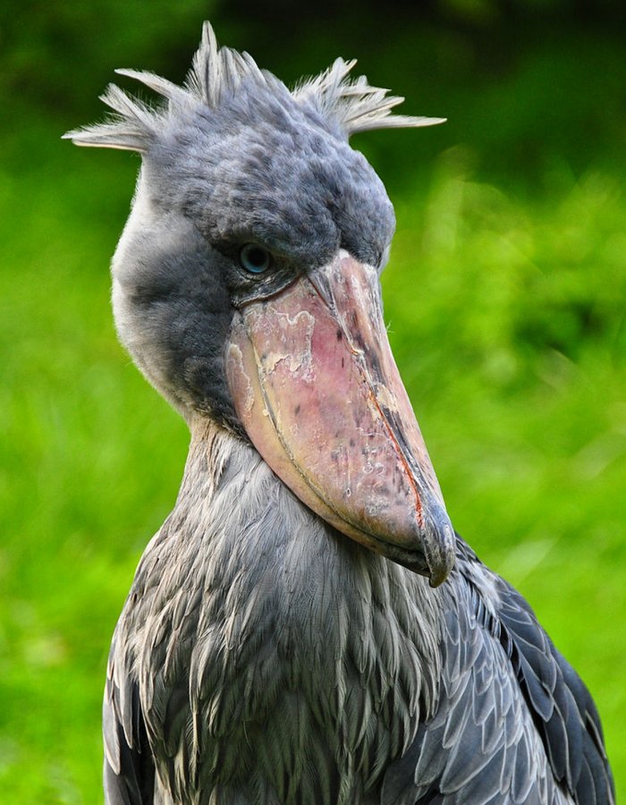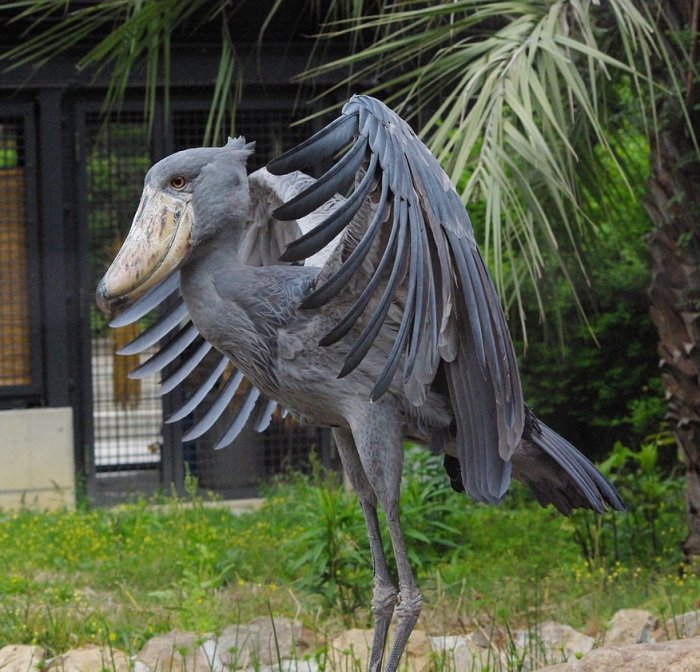 Description : Principalement gris bleuâtre, avec des liserés clairs à toutes les plumes. Sur le sommet du crâne, une courte huppe désordonnée. Yeux jaunes. Le bec énorme et de forme étrange se termine par une griffe - Taille : 1,20 m. Commentaire : Cet oiseau extrêmement farouche habite les marais aux papyrus, où il se nourrit principalement de poissons. On peut l'observer soit seul, soit en compagnie de sa femelle, tandis qu'il marche dans l'eau peu profonde ou se repose en appuyant le grand bec contre sa poitrine. Ces oiseaux pêchent les "dipneustes" dans l'eau trouble et mangent en outre de jeunes crocodiles et des batraciens. On peut les garder en bonne condition en captivité, à la seule condition de présenter régulièrement des Carpes et des Tanches (poissons). Comme les Cigognes, ils communiquent en faisant claquer le bec et recourbant leur grosse tête sur le dos. Lorsqu'ils se sentent menacés, ils ouvrent tout grand leur bec énorme, font claquer les ailes et émettent des cris stridents et rauques. Le fait qu'ils sont apparentés aux Hérons semble affirmé par leur manière de voler en rétractant la tête. Le dos est pourvu, sur toute sa longueur, de duvet poudreux, qu'ils ne savent pas atteindre parce que le large bec est relativement court. Dans les Jardins Zoologiques modernes ils figurent comme des curiosités ornithologiques. m@loute45.