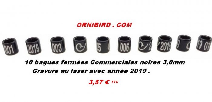 Cliquez sur l'image pour l'agrandir Bagues fermées en métal renforcé numérotées de 1 à 100 par série de 10 avec l'année (2019). Diamètre: 3,5mm Couleur de l'année: Noire Avec le logo Ornibird gravé au laser sur chaque bague. Très bonne finition et inscription très lisible vis à vis des bagues classique Plusieurs diamètres sont disponibles. REMARQUE : - Attention, ce sont des Bagues commerciales avec lesquelleson ne peut participer aux expositions. Seules celles de Fédérations reconnues sont acceptées (AOB- FOW- BPC- UOF- CDE- etc) . Ma devise : "Vous satisfaire au maximum"